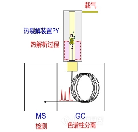 介绍热裂解气质联用(PY-GCMS),是针对高分子聚合物、添加剂、涂料、纤维、弹性体、油墨、纸纤维、橡胶、木材等材料,通过高温裂解方式,将高聚物裂解为碎片(高温下可挥发的小分子),导入色谱质谱GC-MS仪器中,获取裂解产物色谱图,通过色谱图上各碎片峰的质谱图分析,推导分析碎片产物的来源,进行高聚物的分子结构判定的